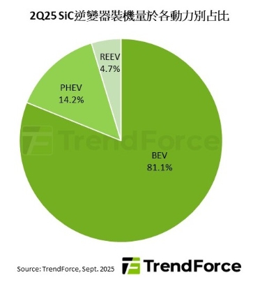就功率半導體在逆變器的應用而言,第二季碳化矽(SiC)逆變器滲透率提升至17%,不僅主要裝機於BEV,亦逐漸擴展至PHEV和REEV,後兩者合計裝機占比近19%,全數由中系車廠貢獻。其中,REEV在主驅逆變器採用SiC的比例更達20%,僅次於BEV的31%。REEV裝機需求拉升並未排擠其他動力車輛需求,反倒是擴大整體逆變器的市場規模,並成為推動SiC機種普及的關鍵。